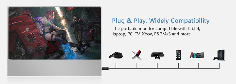 USB-C powered monitor has 2 USB-C and Mini HD input ports, it is compatible with multiple devices: Smart Phone (Android,must have full-featured USB-C port) ), laptops, computers, for Xbox One, PS5/4, Switch, Raspberry Pi, etc.